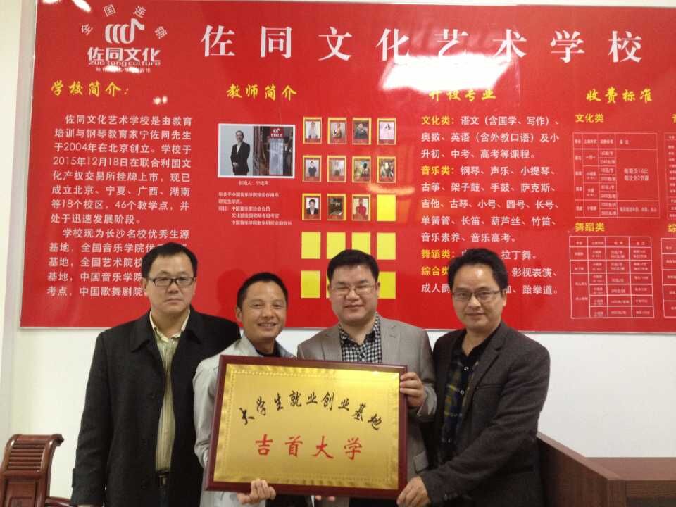 ,我院党总支书记戴军,副院长方东辉,副院长莫宏敏以及就业专干彭立平一行前往长沙佐同文化艺术学校,就我院学生就业创业基地挂牌等相关事宜与佐同文化创始人宁佐同董事长进行了深入洽谈,并最终达成基地建设合作,成功挂牌。