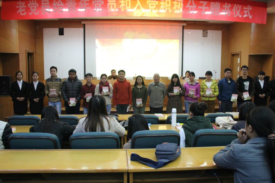 本网讯(通讯员田依依 孙美佳)2015年11月11日晚7点,必赢766net手机版于吉首大学沙子坳校区学术报告厅举行老党员李泽南老师给青年党员和入党积极分子赠书仪式。出席此次仪式的有老党员李泽南老师,院党总支副书记曾一凡,辅导员黄弈及我院青年党员和入党积极分子。赠书仪式由辅导员黄弈主持。