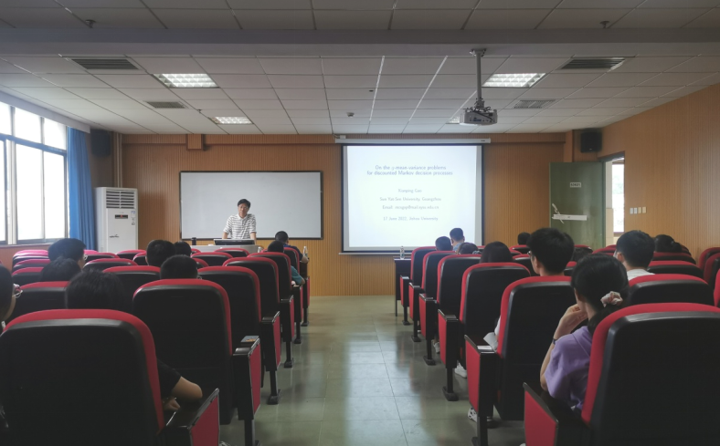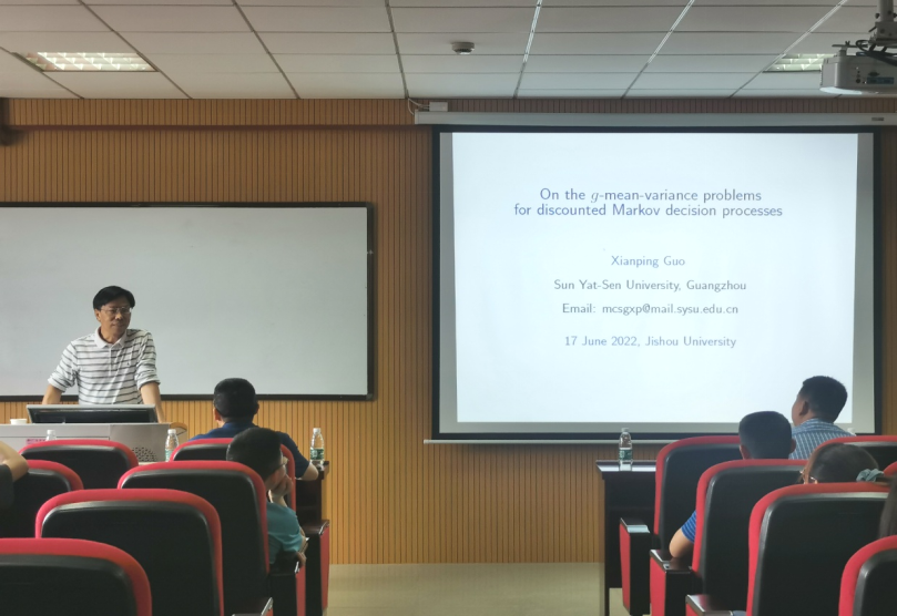 本网讯(通讯员 龙柯宇 邱丽霞 曾昭辉)6月17日上午,中山大学郭先平教授应邀作客我校 “数学文化节系列学术报告”,在总理楼60605学术报告厅为我校师生作了题为《The g-mean-variance problem for discounted CTMDPs》的精彩报告。此次报告由必赢766net手机版院长欧祖军主持,必赢766net手机版师生参加学习。