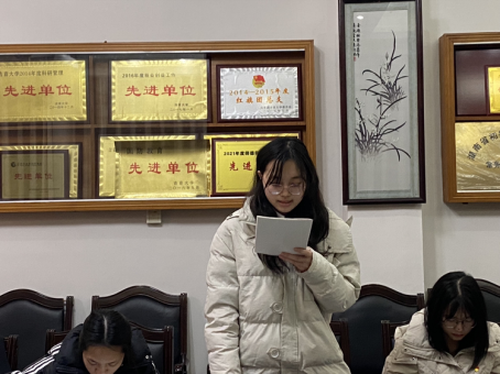 最后,预备党员代表杨诗韵发言。她表示在未来将持续加强理论政治学习,提高理论素养;向实践学习,向人民群众学习;终身在各种考验中忠于自己的誓言。