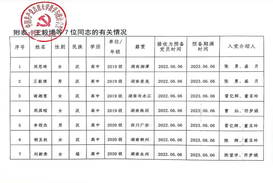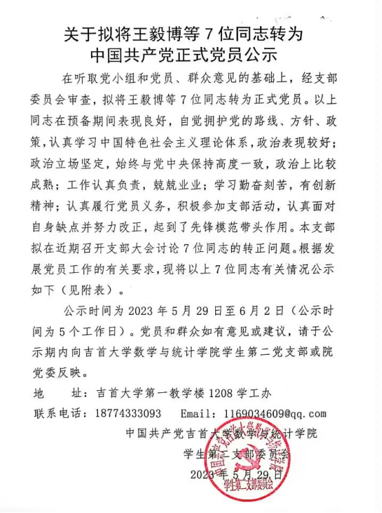 关于拟将王毅博等7位同志转为中国共产党正式党员公示