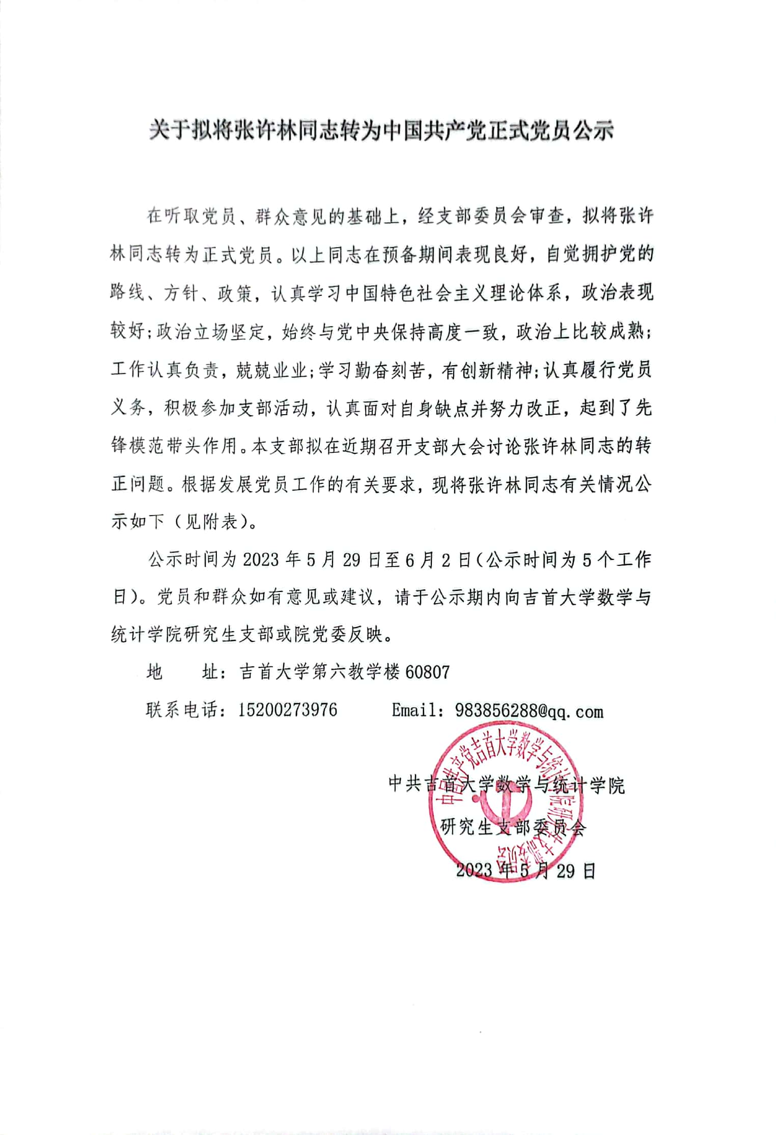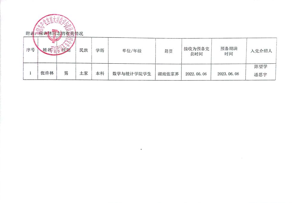 研究生党支部 关于拟将张许林同志转为中国共产党正式党员公示