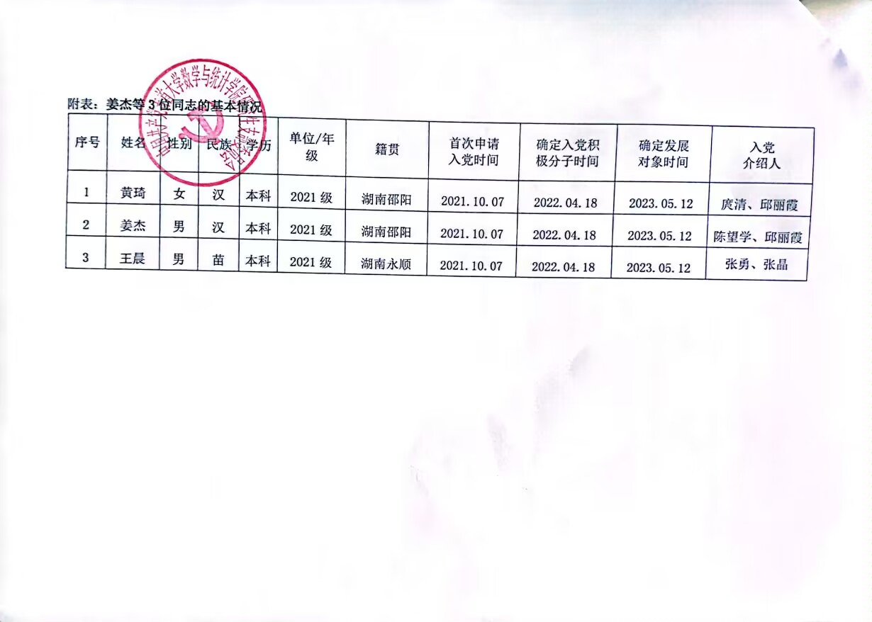 研究生党支部 关于拟接收姜杰等3位同志为预备党员的公示