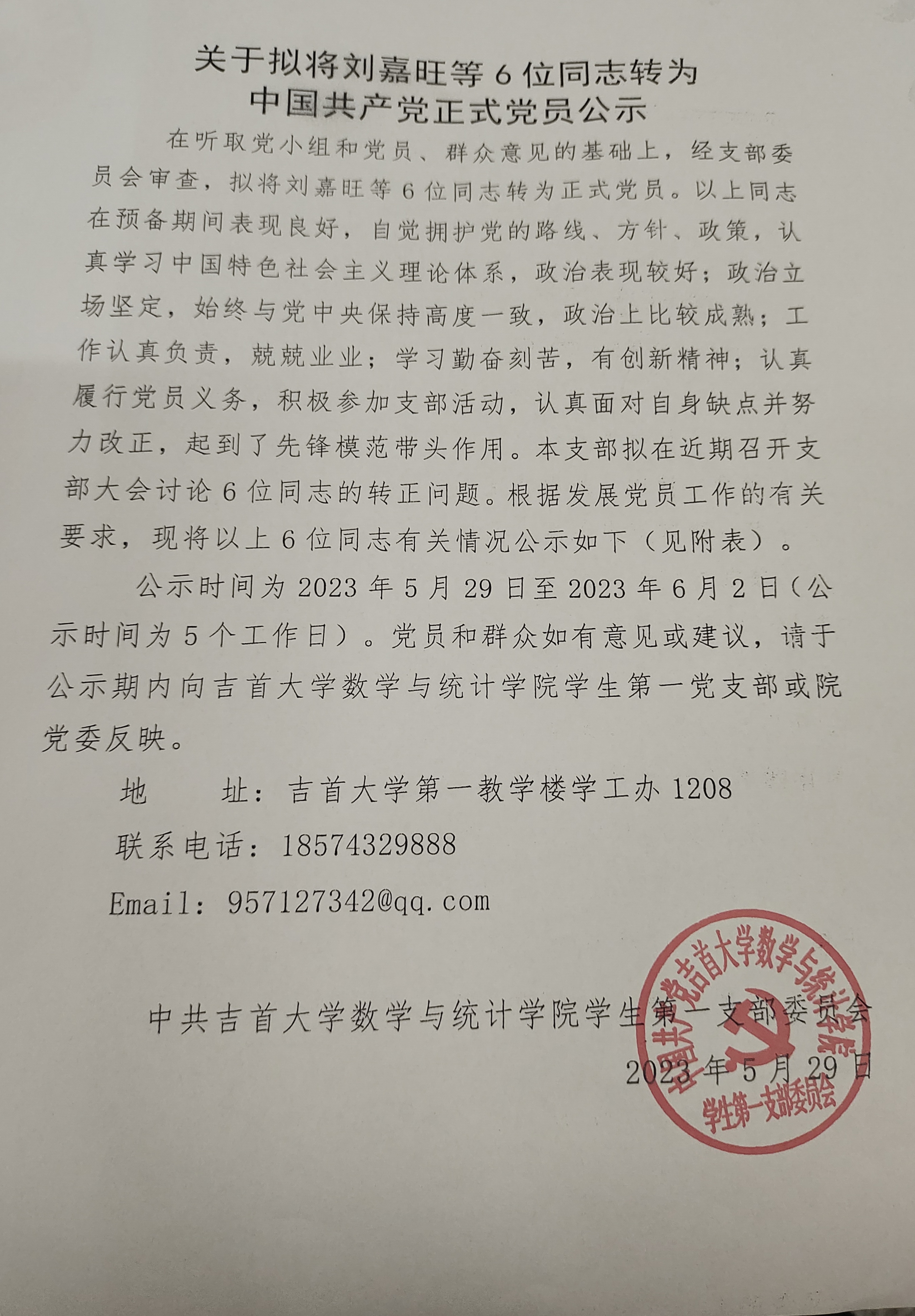 学生第一党支部关于拟将刘嘉旺等6位同志转为中国共产党正式党员公示