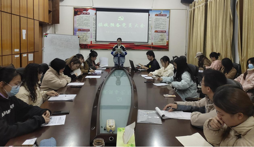 随后,在接收预备党员大会中,申请入党的各位发展对象依次宣读自己的入党志愿,汇报自己在积极分子期间的表现,肯定成绩和进步,找出缺点和不足,表明入党的决心。之后由第一介绍人、第二介绍人分别介绍发展对象的有关情况并对是否同意其加入中国共产党进行表态。随即与会党员对发展对象的表现进行补充意见,而后支部内的正式党员采用无记名投票方式进行表决。最终经大会充分讨论与无记名投票,一致同意胡蓉、周双、蔡谨、伍可欣、陈欢、朱文艳、陈靖、姚梦洁、王棋萝这9位同志接收为中国共产党预备党员,会后报请党委审批!