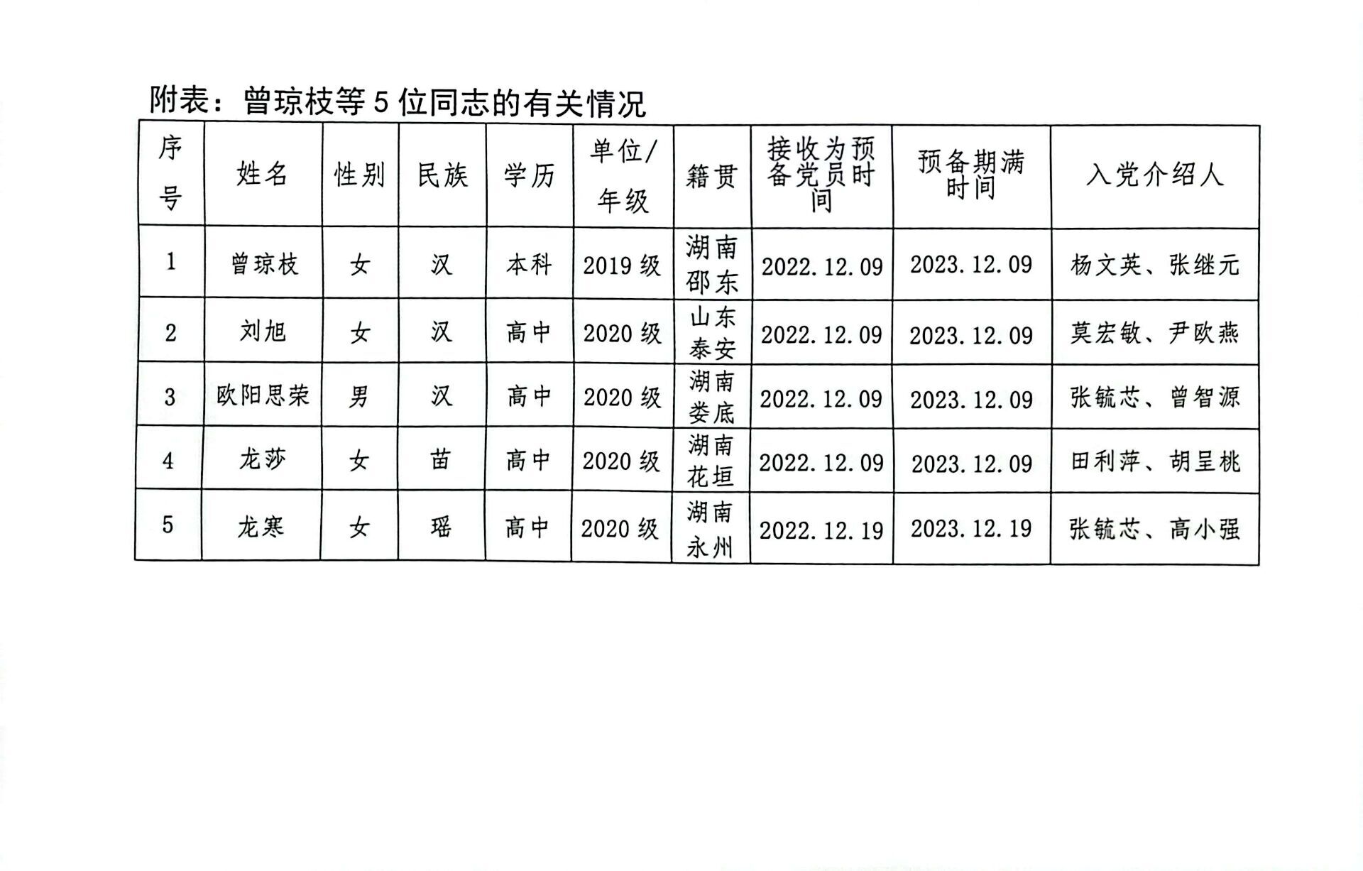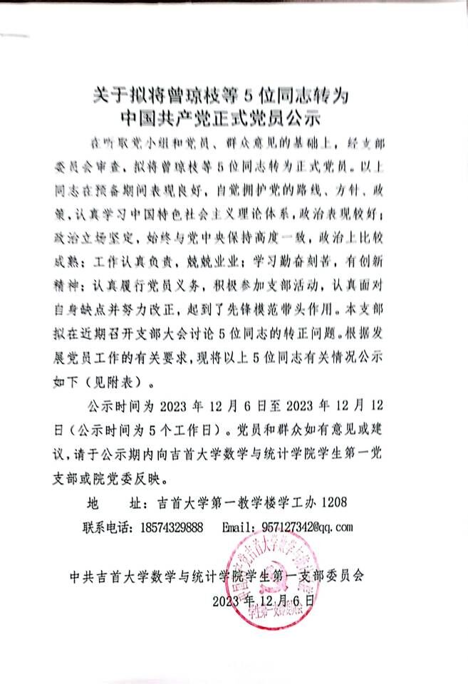 学生第一党支部关于拟将曾琼枝等5位同志转为中国共产党正式党员公示
