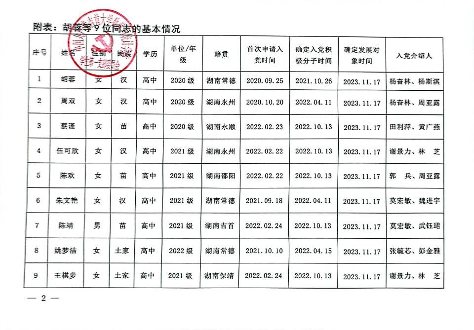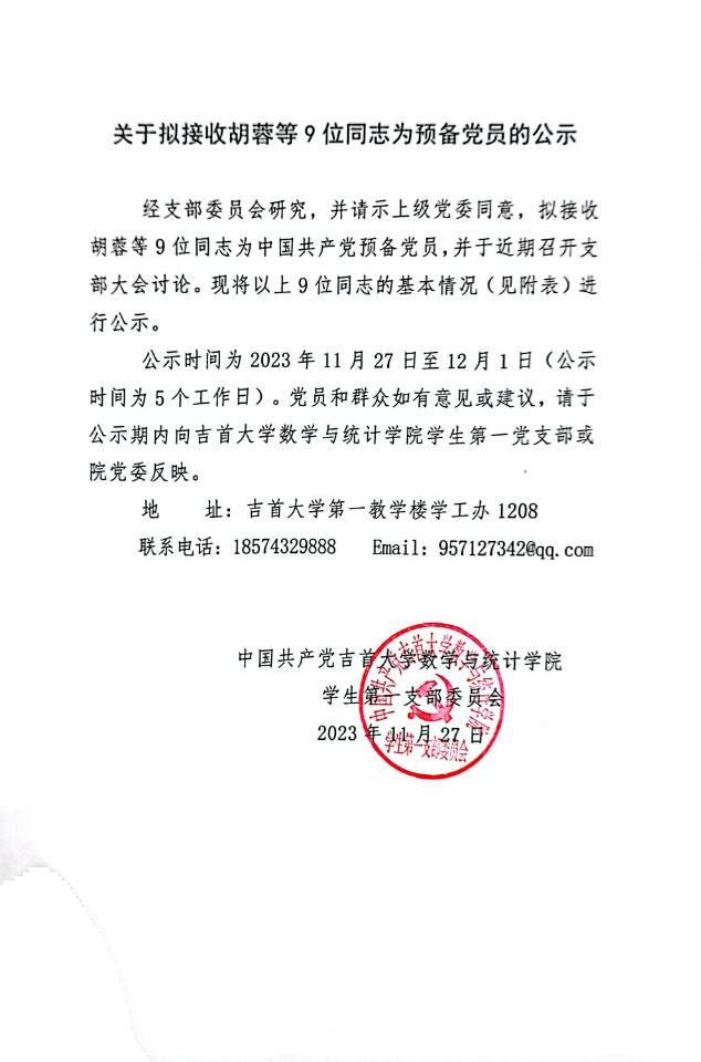 学生第一党支部关于拟接收胡蓉等9位同志转为预备党员公示