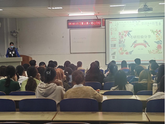 杨榕同学先询问了同学们考研的目的是什么,并点出了许多同学其实并没有做好长期备战考研的打算。然后通过指出国内历年考研报录比的数据与选择考研的人占毕业生中的比例逐年上升说明考研竞争日趋激烈,并告诫同学们应当在考研和就业中做出合适的选择,引发了同学们的深思。