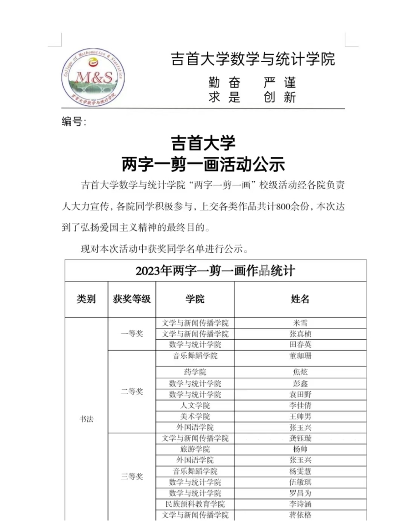 通过此次两字一剪一画比赛,激励大学生深刻领会“以美育人,以文化人”的教育内涵,让同学们在中国 优秀传统文化的熏陶下增强爱国意 识。 同时,该活动能够为大学生能力的培养提供广阔空间,拓宽大学生的知识面。可以培养大学生结合时代要求继承创新,让中华文化展现出永久魅力和时代风采,培养正确的世界观、人生观,培育良好的艺术情操,提高自身素质。
